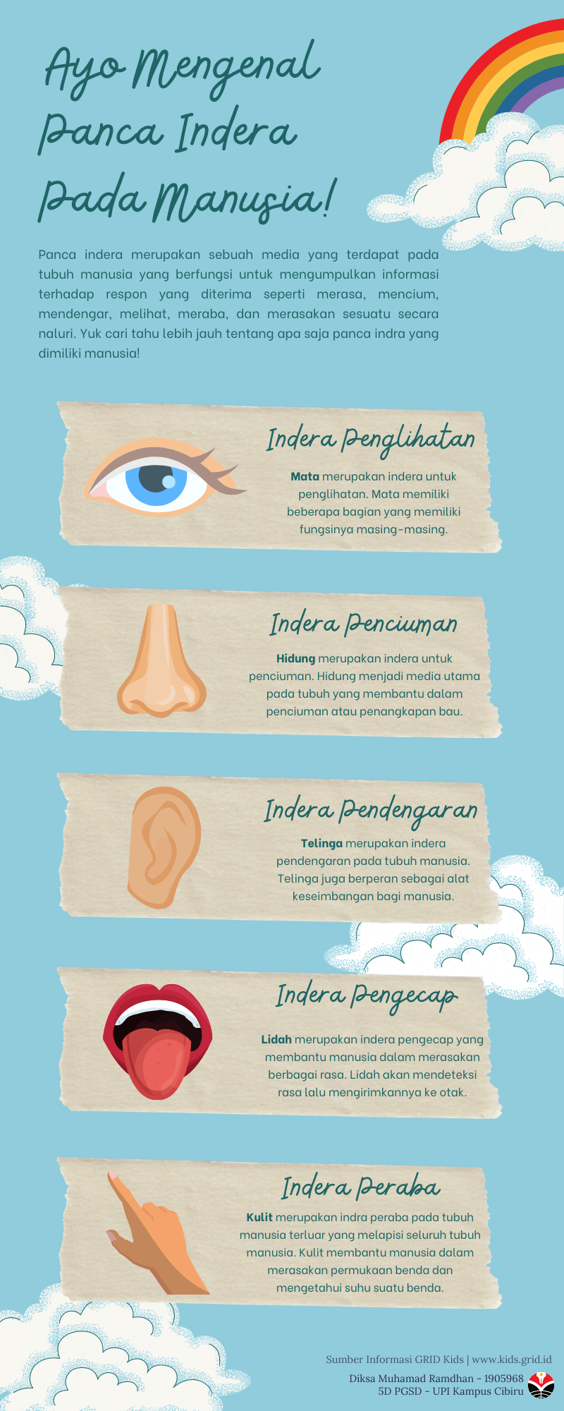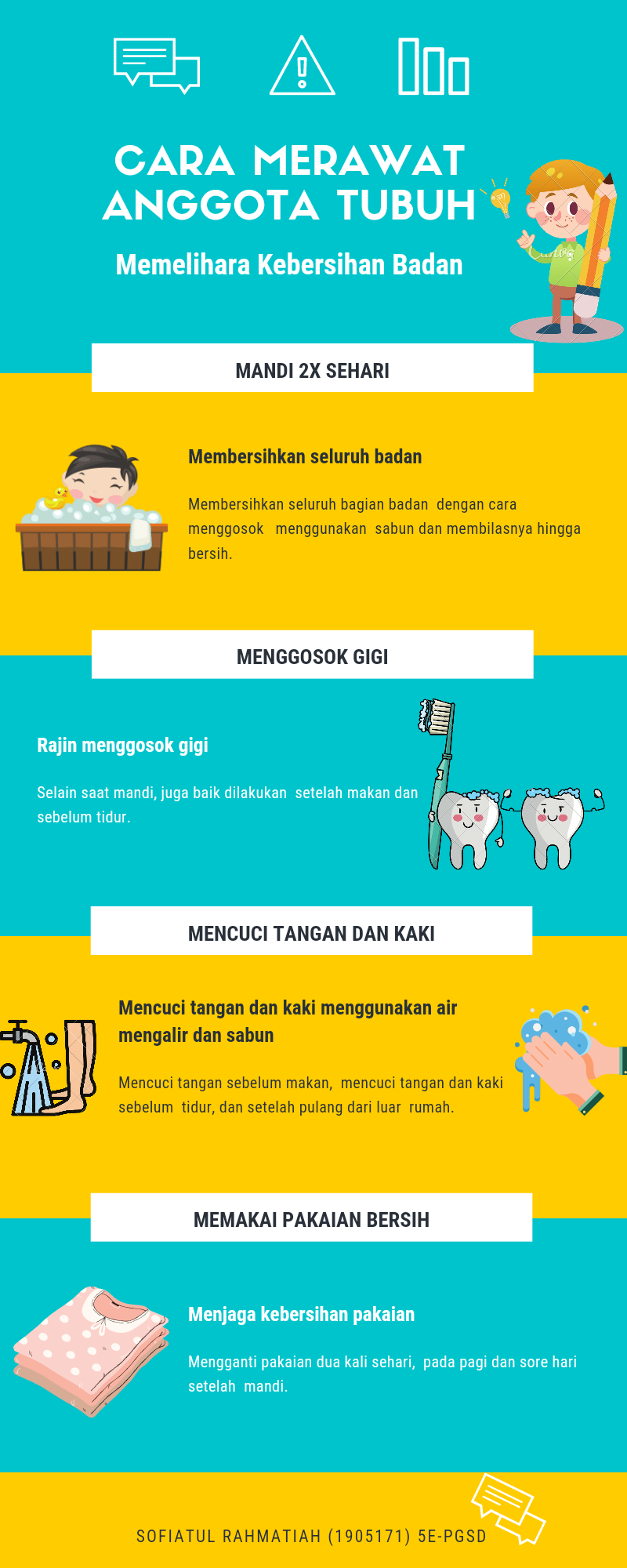 Media pembelajaran berbentuk infografis ini ditujukan untuk siswa kelas 1 sekolah dasar terkait cara merawat anggota tubuh. Di dalamnya diperlihatkan cara memelihara kebersihan badan agar tubuh terhindar dari penyakit. Dengan memadukan antara gambar dan teks singkat diharapkan siswa dapat dengan mudah memahaminya.