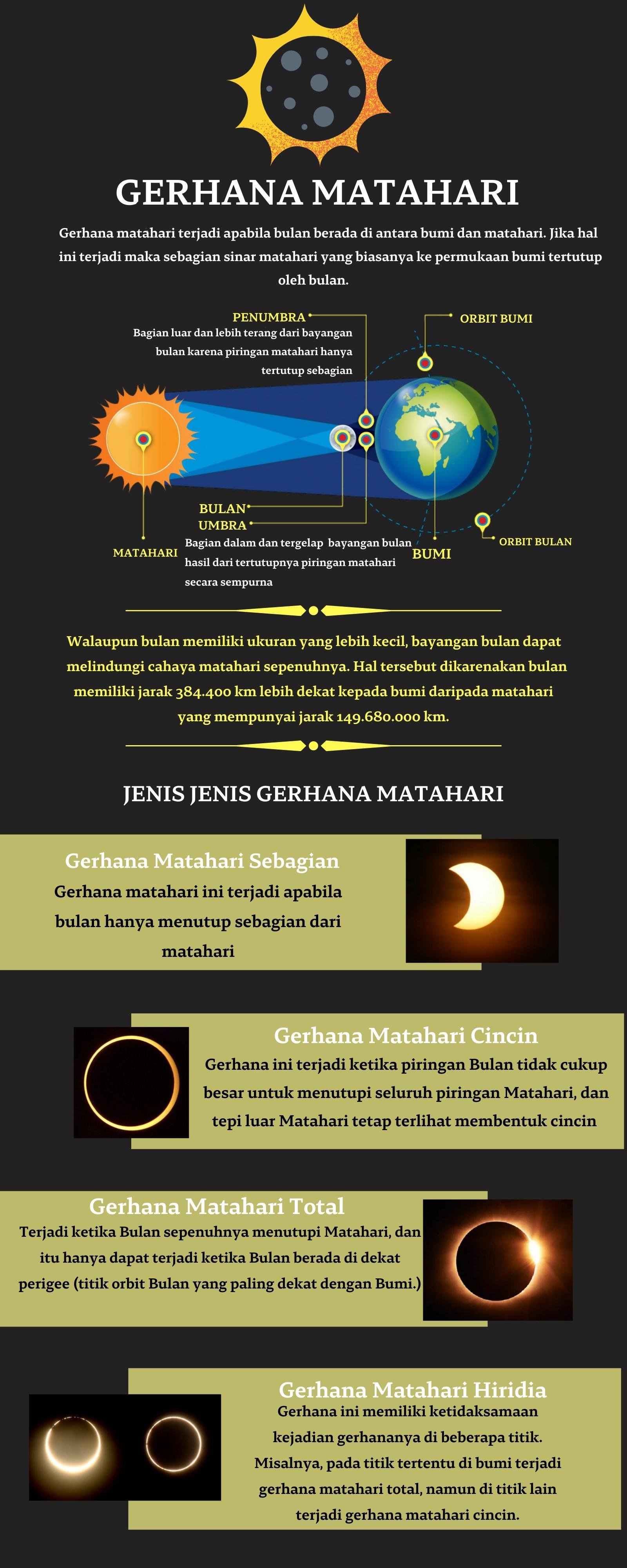 Berikut adalah infografis mengenai bagaimana gerhana matahari terjadi dan jenis jenis dari gerhana matahari yang terjadi. semoga menambah wawasan adik adik ya