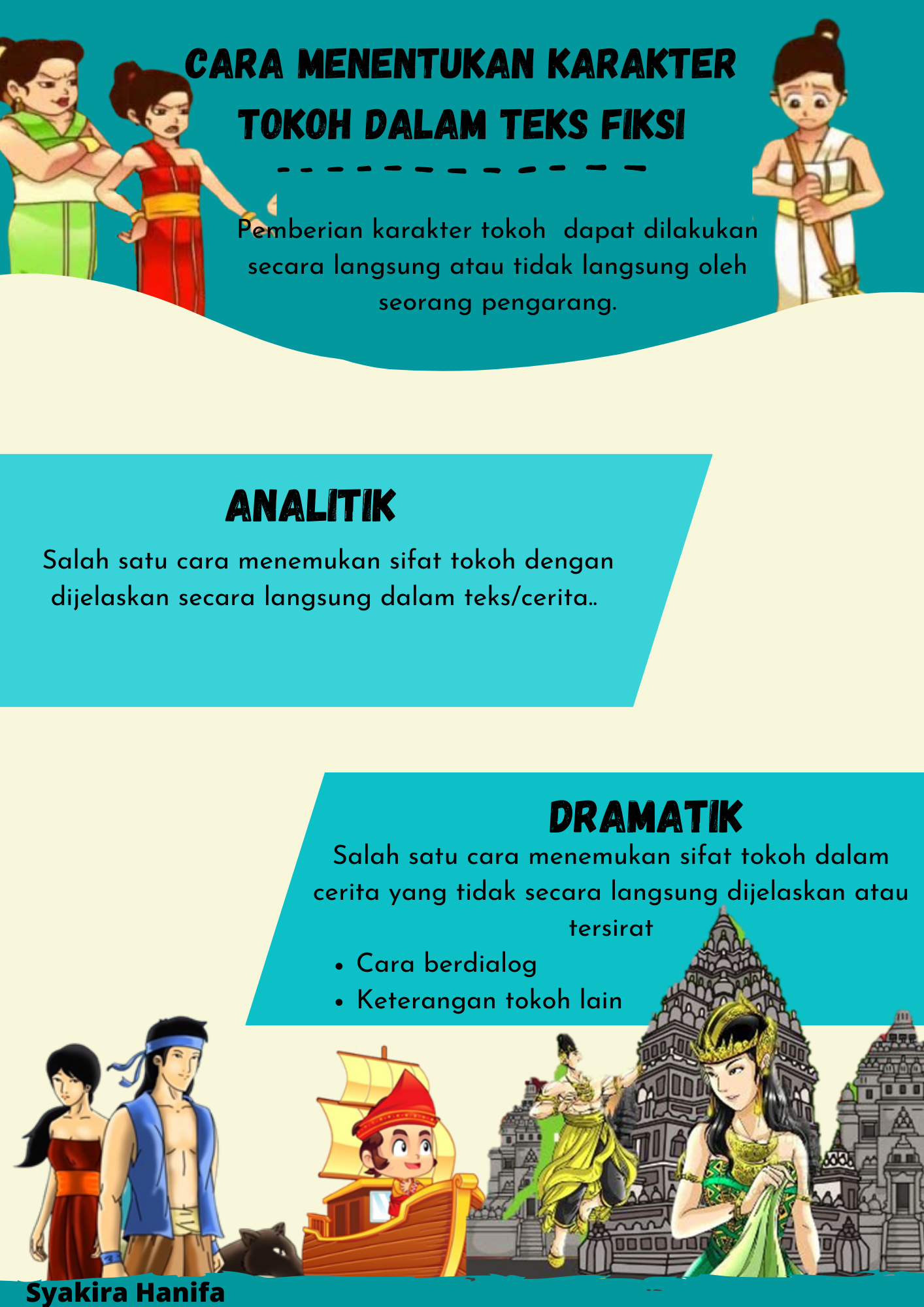 Infografis ini berisikan mengenai materi cara menentukan karakter tokoh dalam teks fiksi dengan cara analitik dan dramatik untuk kelas 4 SD