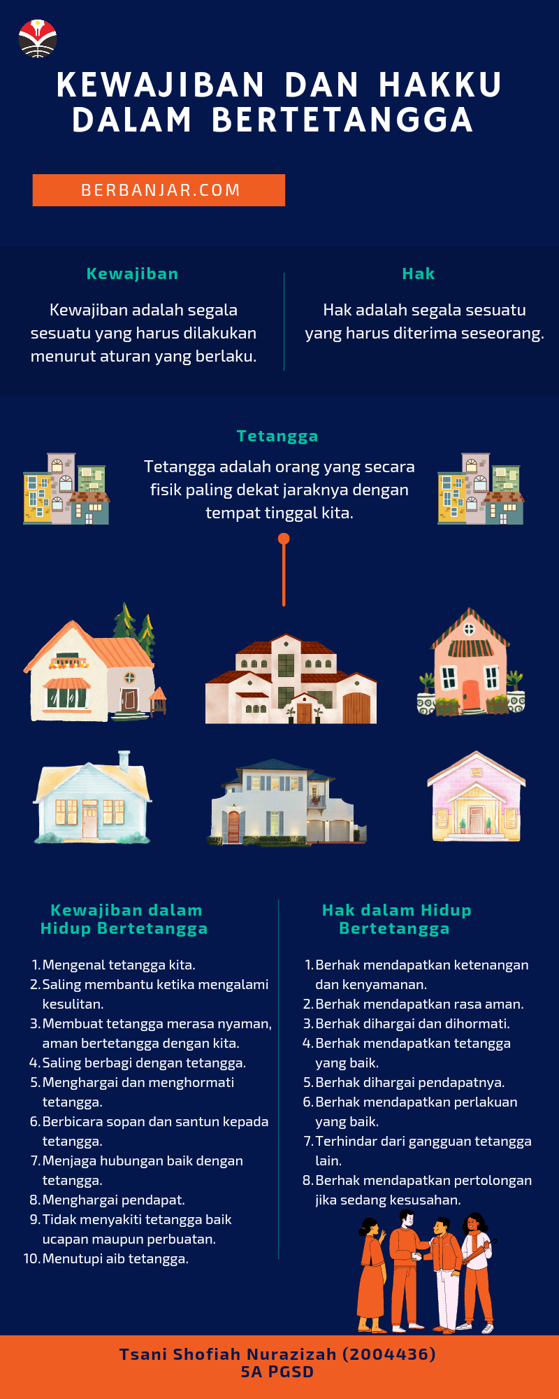 Infografis ini berisi informasi tentang : 1. Pengertian kewajiban 2. Pengertian hak 3. Pengertian tetangga 4. Kewajiban dalam hidup bertetangga 5. Hak dalam hidup bertetangga