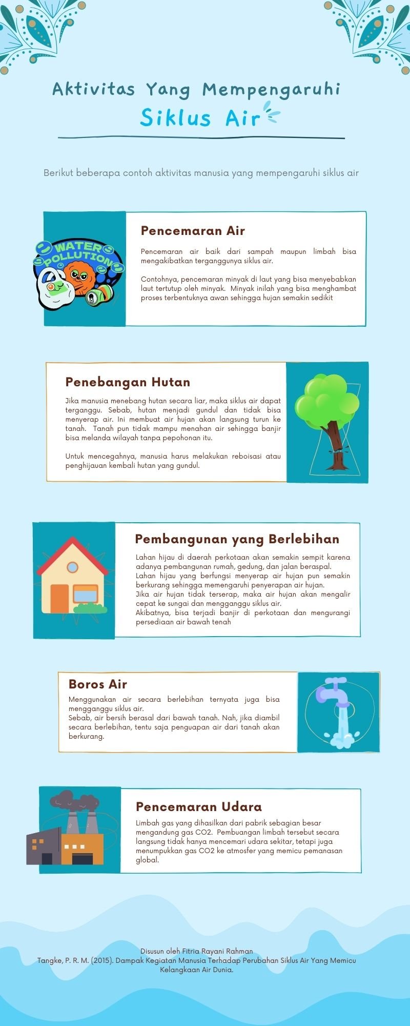 Air merupakan cairan jernih yang tidak berwarna, berasa, dan berbau. Manusia membutuhkan air untuk memenuhi kehidupan sehari-hari. Seperti yang kita ketahui, air memiliki peran penting bagi makhluk hidup terutama manusia. Namun, beberapa kegiatan yang dilakukan manusia bisa memengaruhi siklus air.