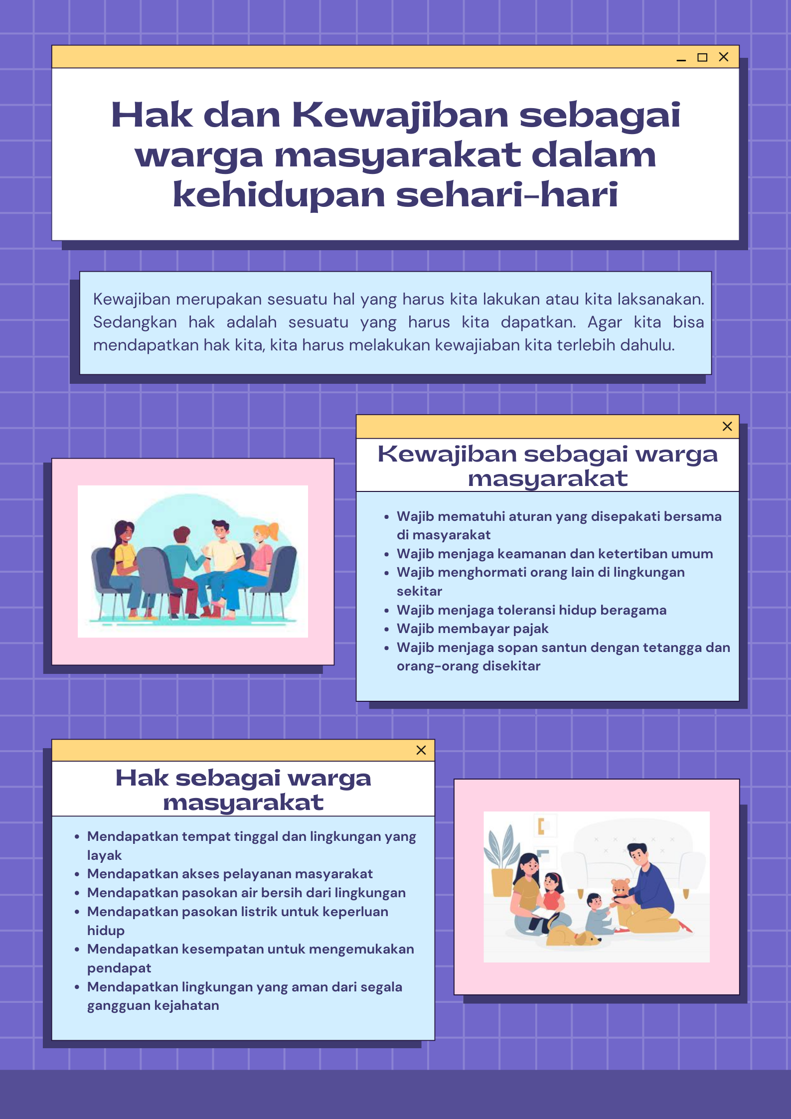 Grafis ini berisikan materi hak dan kewajiban sebagai warga masyarakat dalam kehidupan sehari-hari yang tercantum dalam 2 subtema 2 kelas 4 SD, Siti Fadia Nurul Fitri (2008612) 5B PGSD