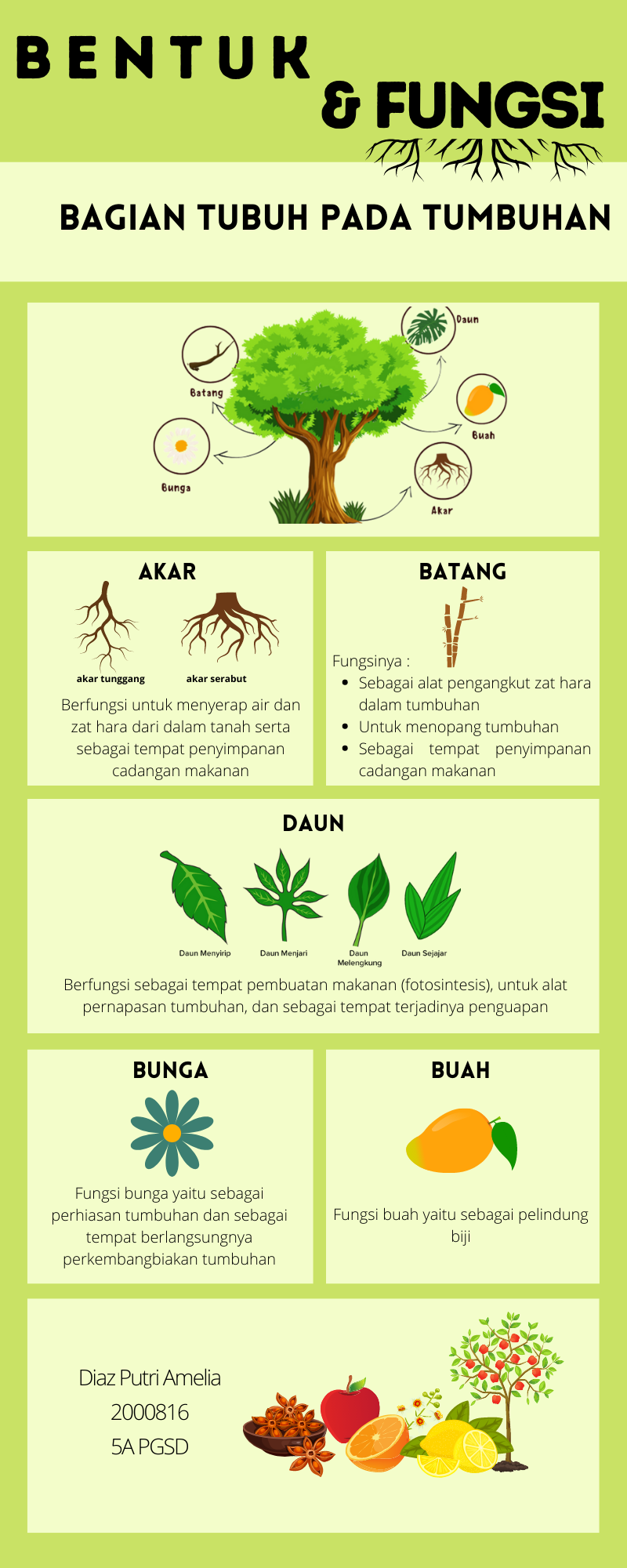 Judul : Infografis tentang Bentuk dan Fungsi Bagian Tubuh pada Tumbuhan Nama : Diaz Putri Amelia NIM : 2000816 Kelas : 5A PGSD