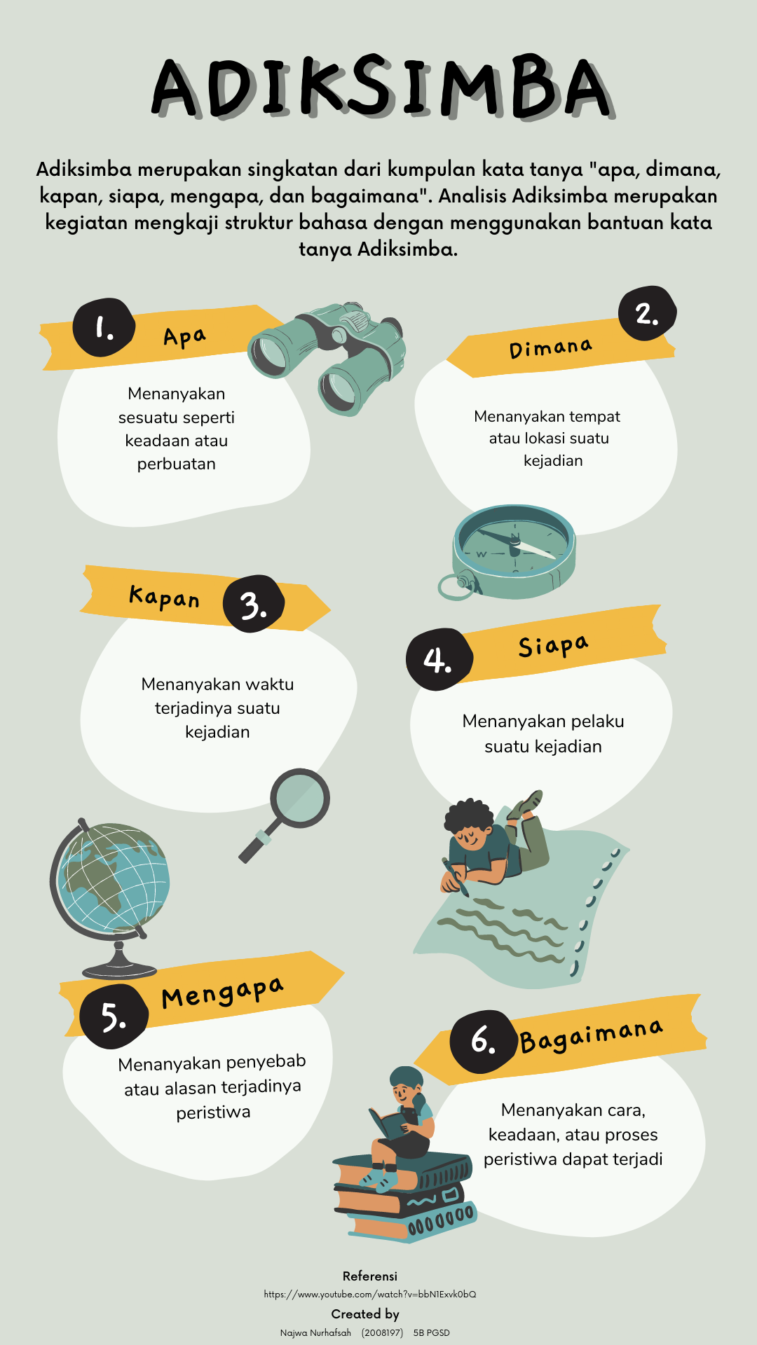 Adiksimba merupakan singkatan dari kumpulan kata tanya “apa, dimana, kapan, siapa, mengapa, dan bagaimana”. Analisis Adiksimba merupakan kegiatan mengkaji struktur bahasa dengan menggunakan bantuan kumpulan kata tanya Adiksimba.