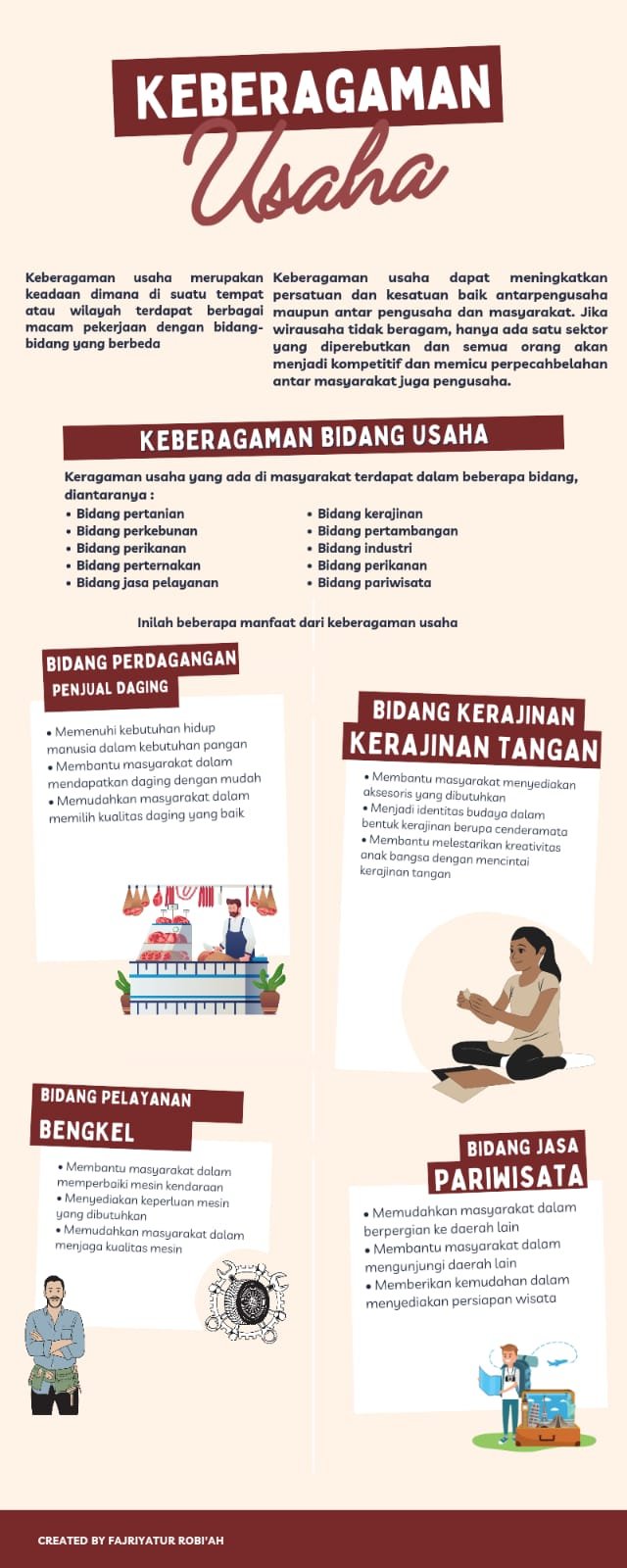 Infografis ini berisi informasi mengenai apa itu keberagaman usaha, manfaatnya, jenis bidang usaha serta manfaat dari beberapa usaha yang terdaoat dikehidupan sehari-hari