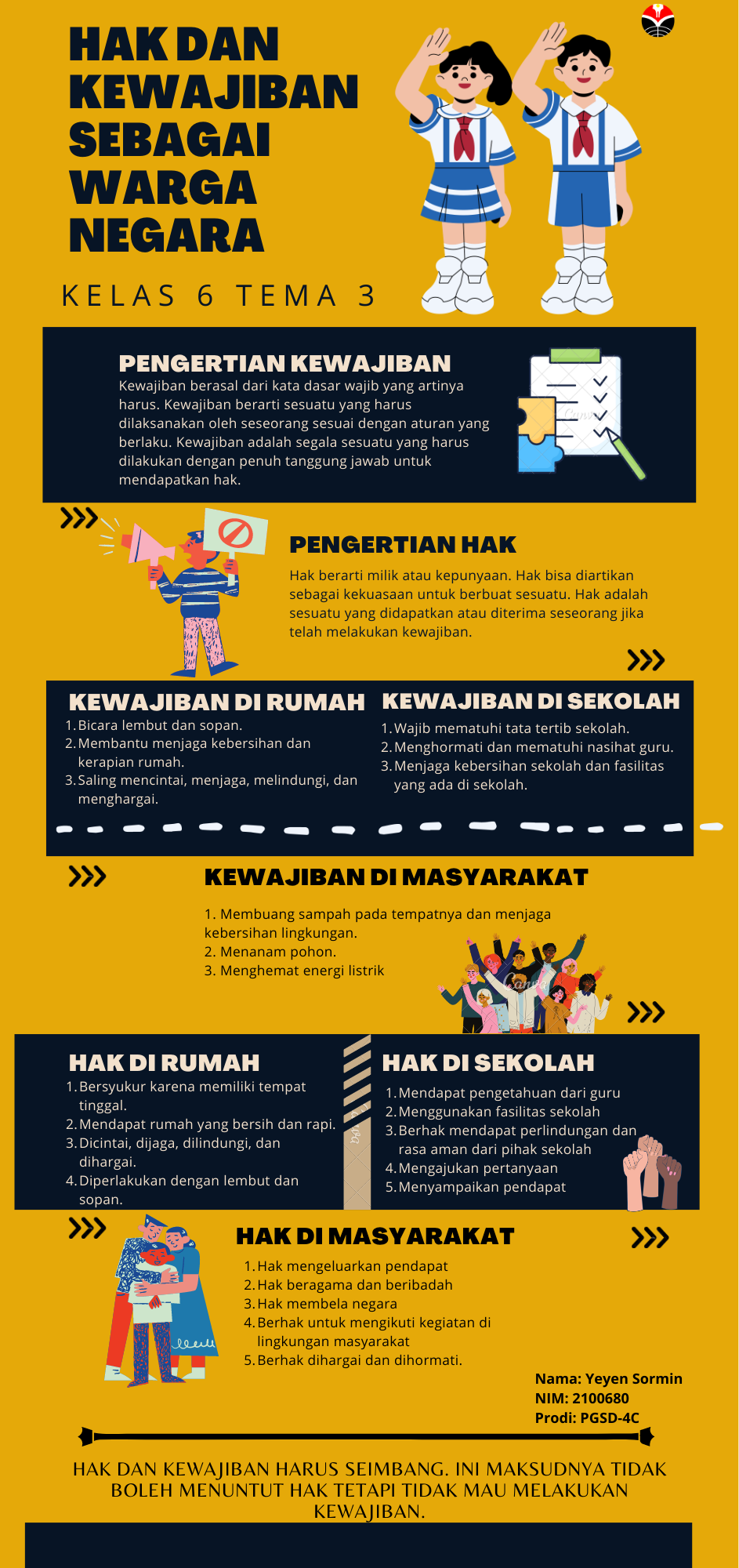 Materi yang terdapat di infografis mengenai Kewajiban dan Hak seorang anak sebagai warga negara, Infografis ini ditujukan agar siswa dapat menganalisis pelaksanaan hak dan kewajiban sebagai warga negara.