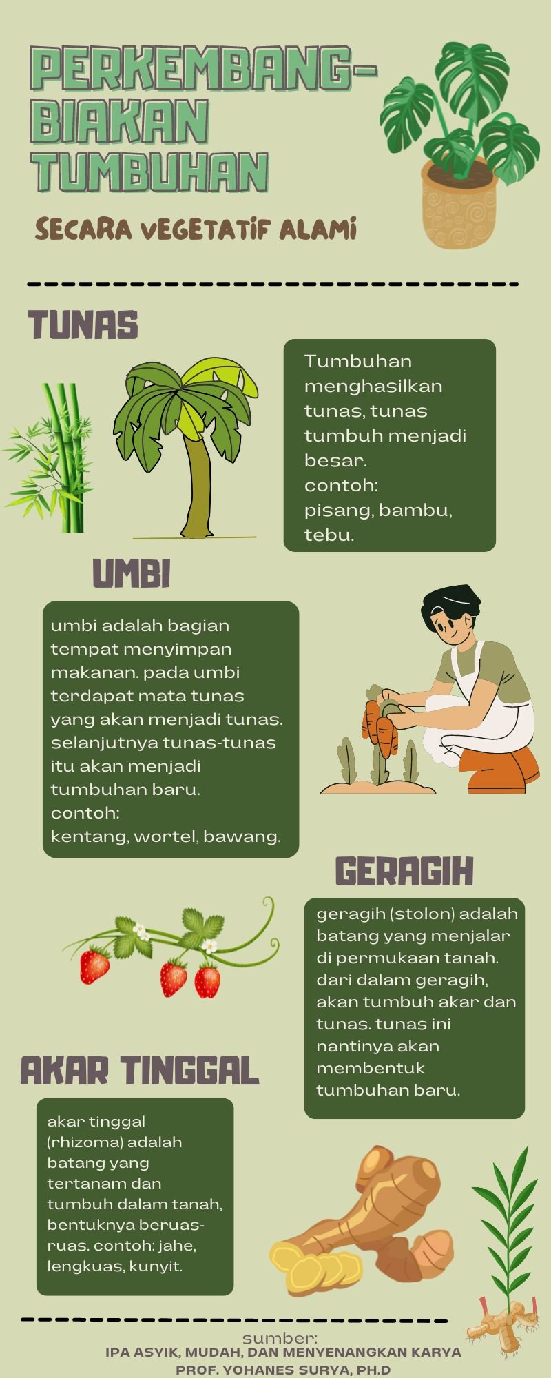 Infografis ini berisi macam-macam perkembangbiakan tumbuhan secara vegetatif alami dan contoh tumbuhannya.