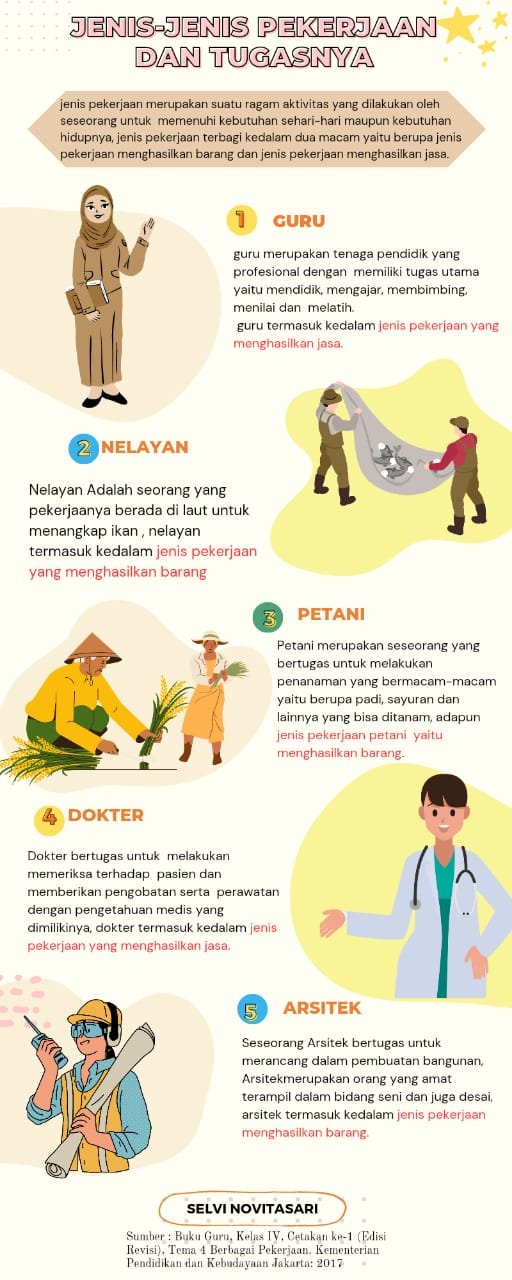 Jenis pekerjaan merupakan suatu ragam aktivitas yang dilakukan oleh sekarang untuk memenuhi kebutuhan sehari-hari maupun kebutuhan hidupnya, jenis pekerjaan ini juga terbagi kedua macam yaitu jenis pekerjaan yang menghasilkan jasa dan jenis pekerjaan yang menghasilkan barang.