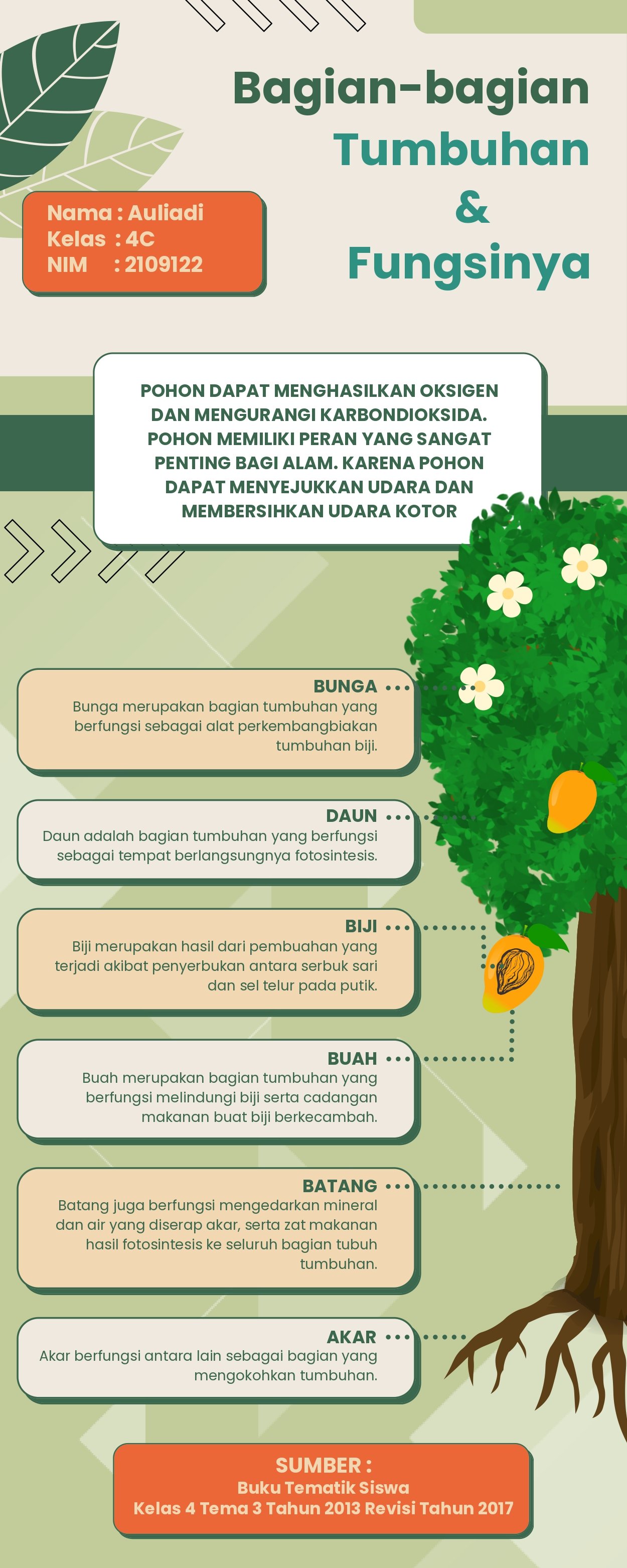 infografis ini merupakan sebuah media pembelajaran pada mata pelajaran IPA mengenai bagian-bagian tumbuhan dan fungsinya. Tujuan dibuatnya infografis ini untuk manambah semangat siswa saat pembelajaran berlangsung serta untuk mempermudah penyampaian pesan pembelajaran kepada siswa.
