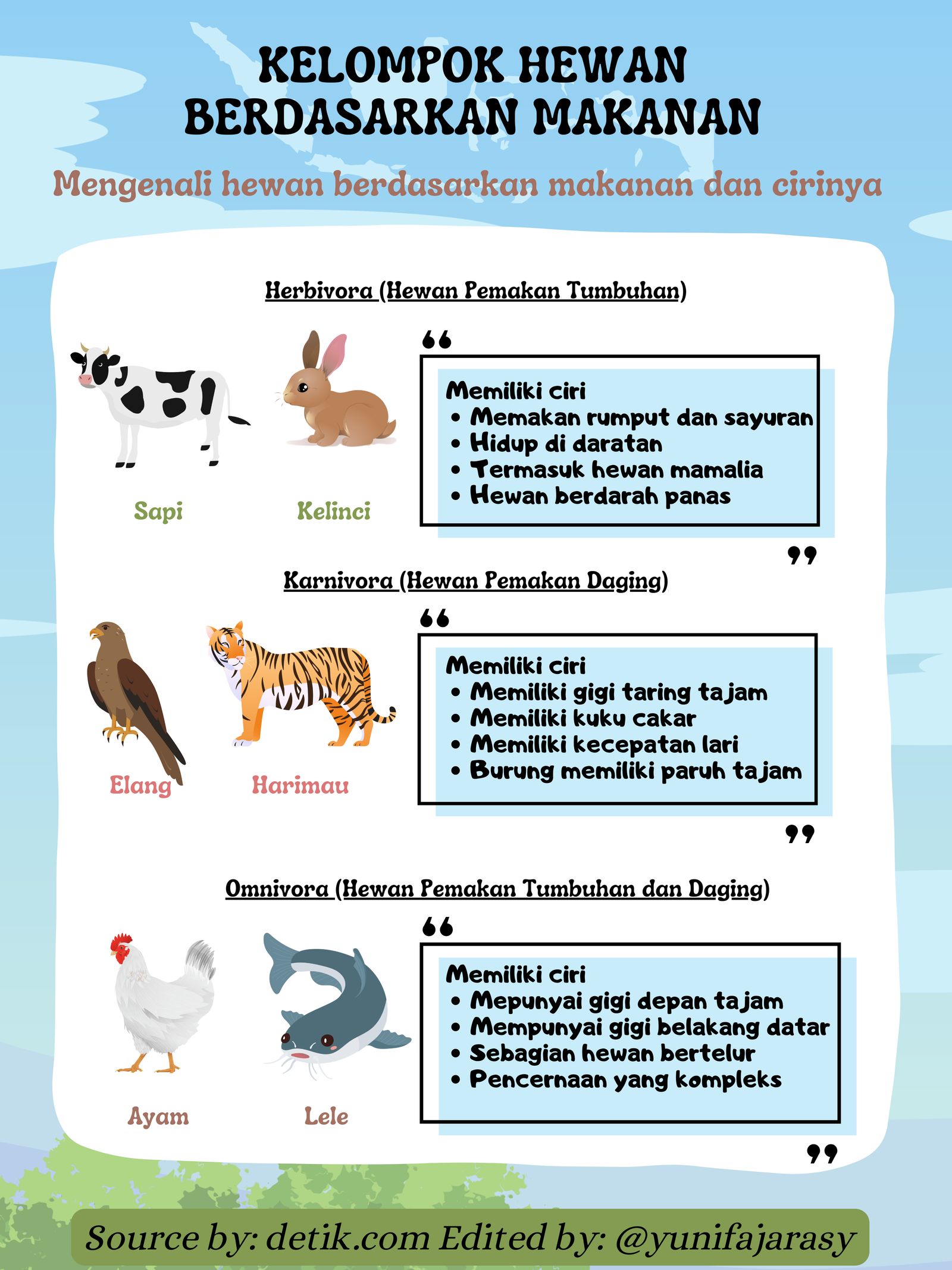 Infografis ini berisi tentang penjelasan mengenai kelompok hewan berdasarkan jenis makanannya dan cirinya