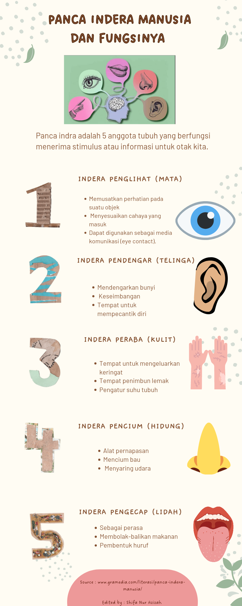 Panca indra adalah 5 anggota tubuh yang berfungsi menerima stimulus atau informasi untuk otak kita. Panca indra ini terdiri dari penglihatan (mata), pendengaran (telinga), peraba (kulit), penciuman (hidung), dan pengecap (lidah).