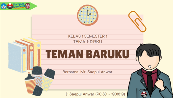 Media Powerpoint Materi Teman Baru menjelaskan tentang materi cara memperkenalkan diri saat bertemu dengan teman baru. Cara memperkenalkan diri; menyebutkan salam, nama lengkap, nama panggilan dan alamat rumah. Sikap tubuh saat berkenalan; wajah tersenyum ceria, lihat wajah temanmu, jabat tangan, tubuh tegak dan tangan kiri di samping kiri.