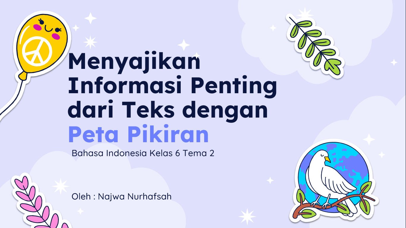 Video Pembelajaran mengenai Menyajikan Informasi Penting dari Teks dengan Peta Pikiran. Dimana peta pikiran adalah penyajian atau penyampaian ide, konsep, maupun informasi secara visual. Informasi pada peta pikiran atau yang lebih dikenal dengan sebutan mind mapping ini lebih banyak disajikan dalam bentuk gambar ataupun diagram daripada tulisan.