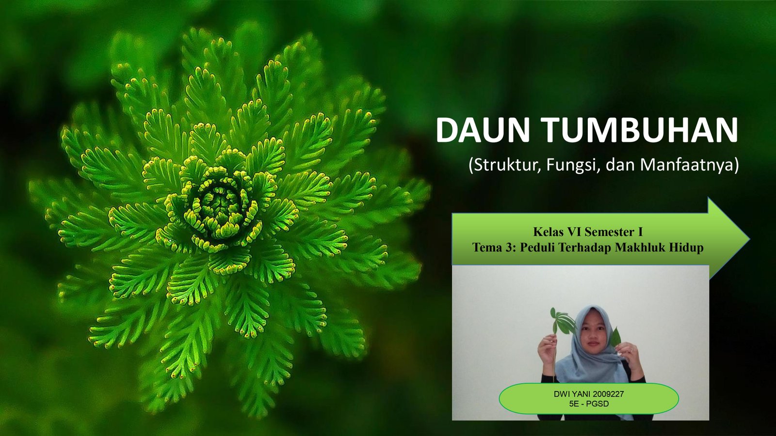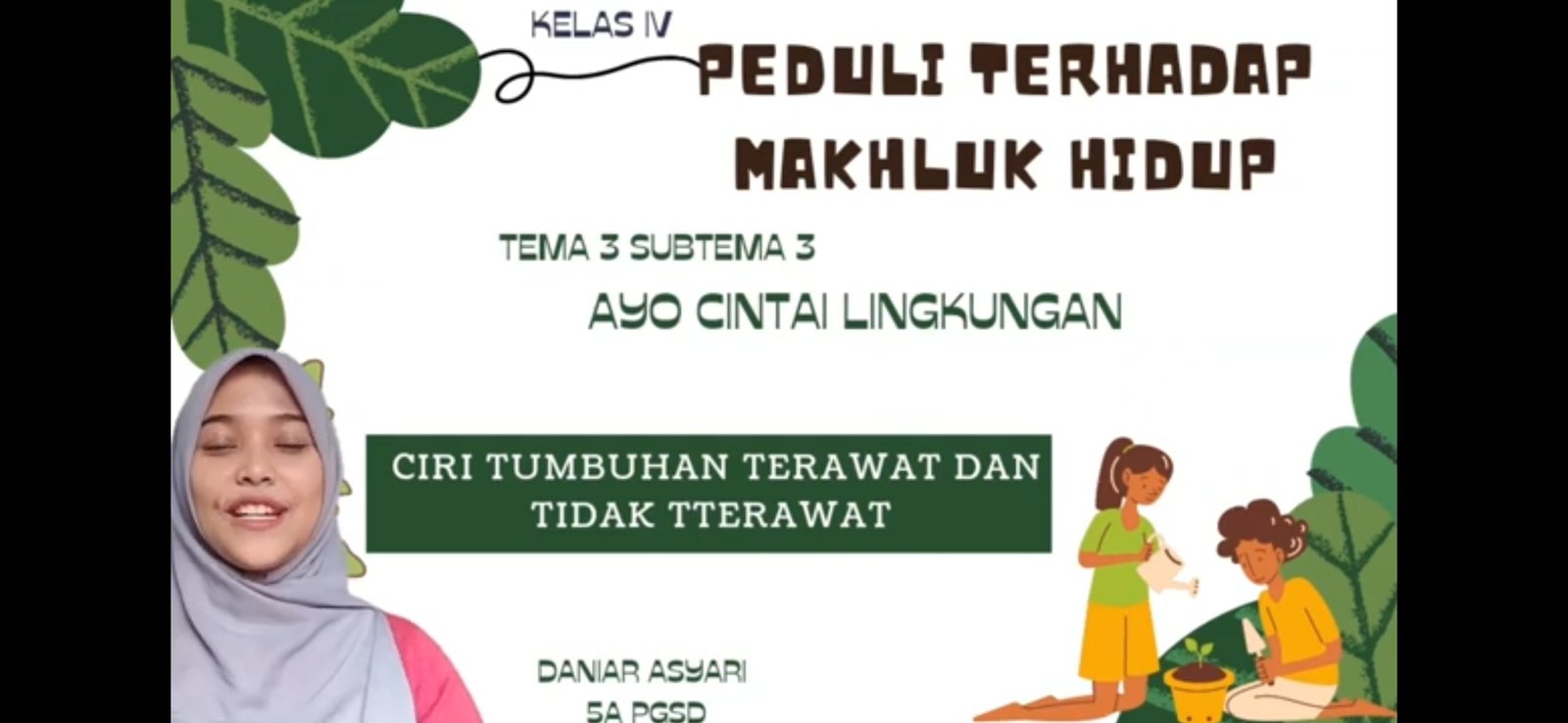 Video ini ditujukan untuk siswa-siswi kelas IV semester I, pembelajaran dengan Tema 3: Peduli Makhluk Hidup subtema Hewan dan Tumbuhan di Lingkungan Rumahku. Pada materi ini membahas mengenai bagian dan ciri-ciri tumbuhan, yaitu mempunyai daun. Daun merupakan bagian tumbuhan yang tumbuh pada ranting atau batang dan biasanya tumbuh berhelai-helai hingga lebat. Daun diibaratkan sebagai pabrik dalam tumbuhan. Mengapa demikian? Pada video ini akan menjawab semuanya 😃