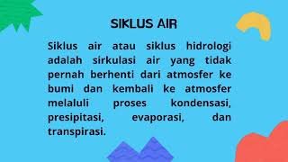 Dalam video menjelaskan tentang proses siklus air yang dimulai dari Evaporasi, Kondensasi, Prsipitasi dan Infiltrasi. Lalu juga menyebutkan manfaat dari siklus air tersebut.