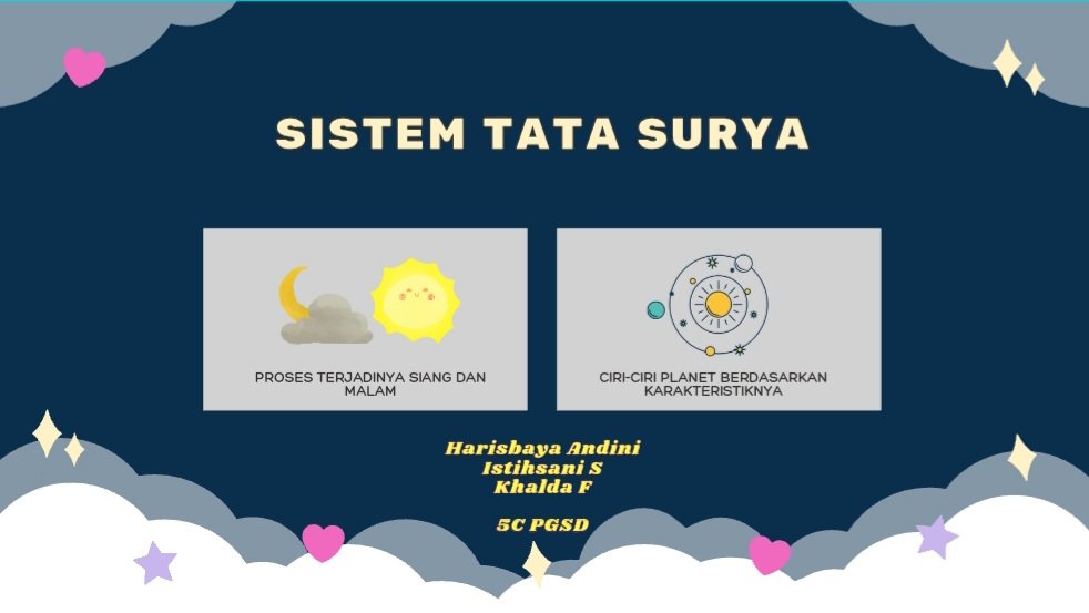 Materi ini menjelaskan bagaimana proses terjadainya siang dan malam serta ciri-ciri setiap planet sesuai dengan karakteristiknya. Video ini di buat oleh: 1. Harisbaya Andini (1900205) 2. Istihsani Suryadikusumah (1902215) 3. Khalda Fauziah (1905407)
