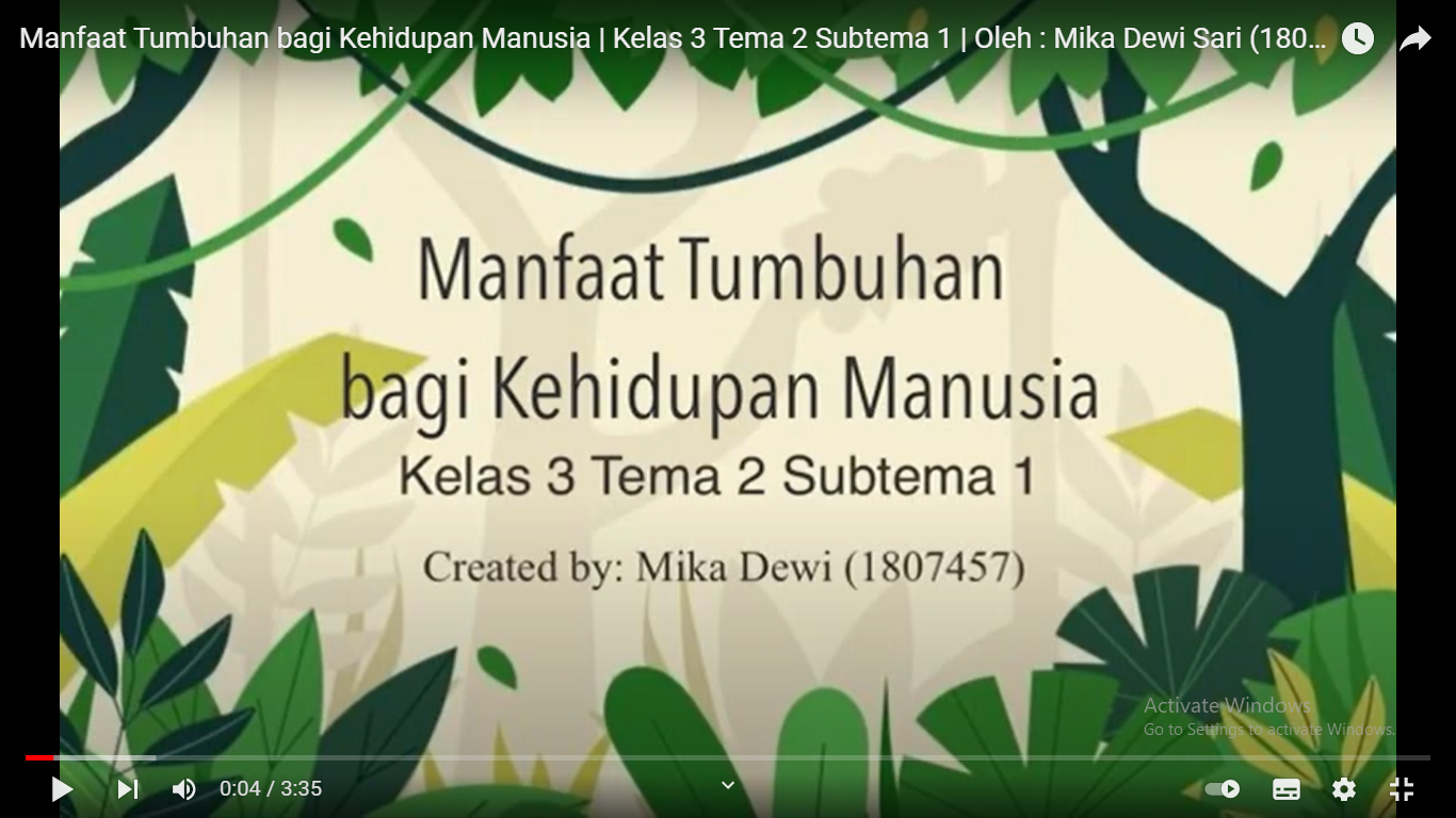 Video ini berisikan tentang materi Kelas 3 Tema 2 Subtema 1 mengenai Manfaat tumbuhan bagi kehidupan manusia. Video disajikan dalam bentuk presentasi. Isi materi yang disampaikan adalah mengenai pengertian tumbuhan, manfaat tumbuhan bagi kehidupan manusia yang terdiri dari sebagai sumber bahan makanan, sumber bahan serat untuk sandang, sumber bahan obat-obatan, sumber bahan material dan sumber oksigen, serta memberikan seruan kepada siswa untuk bersama-sama menjaga kelestarian tumbuhan untuk kelangsungan makhluk hidup terutama manusia.